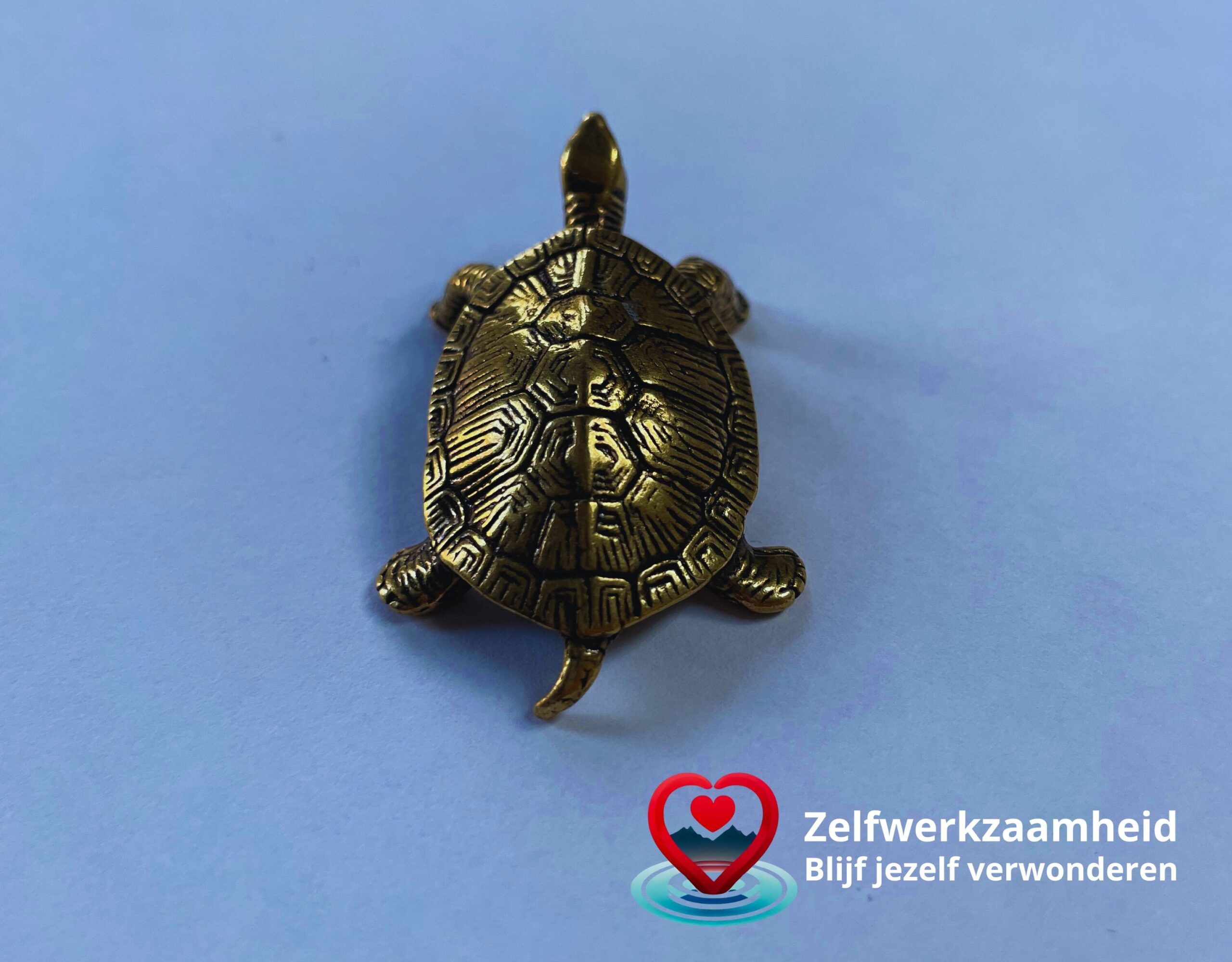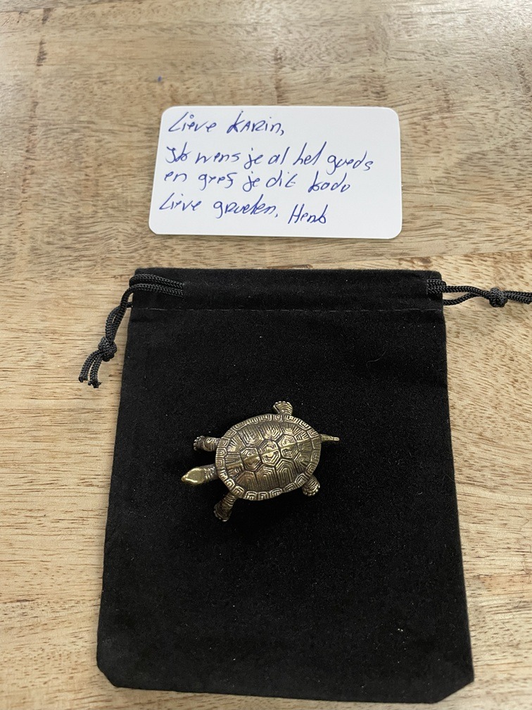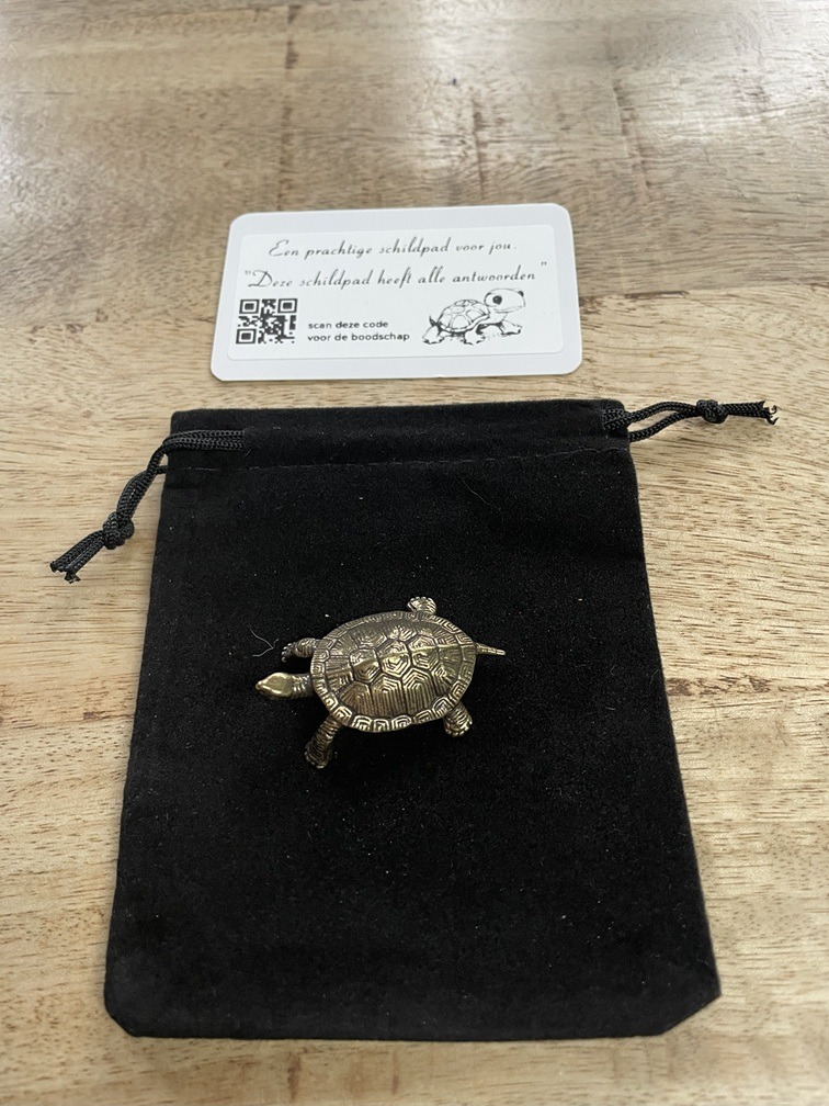 Een Messing Schildpadje in een fluwelen zakje met een persoonlijk kaartje. Een prachtig kado om te geven als steun en liefde voor de ander.